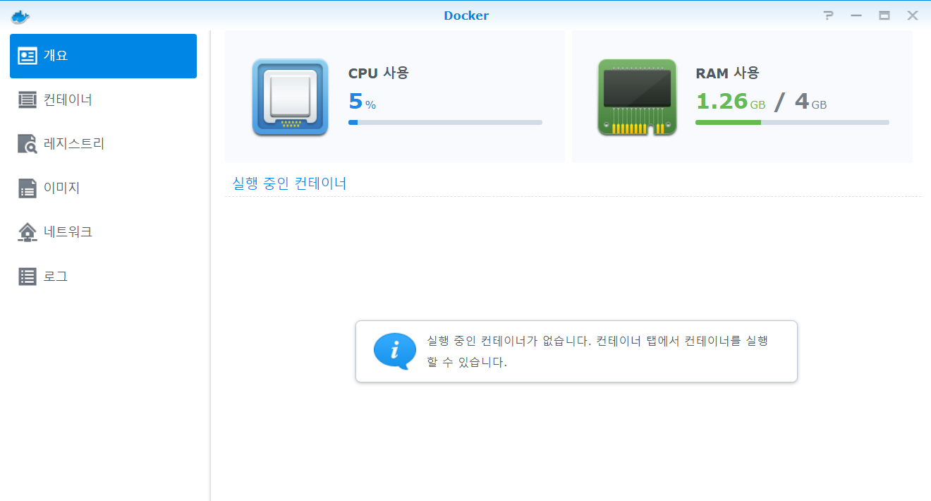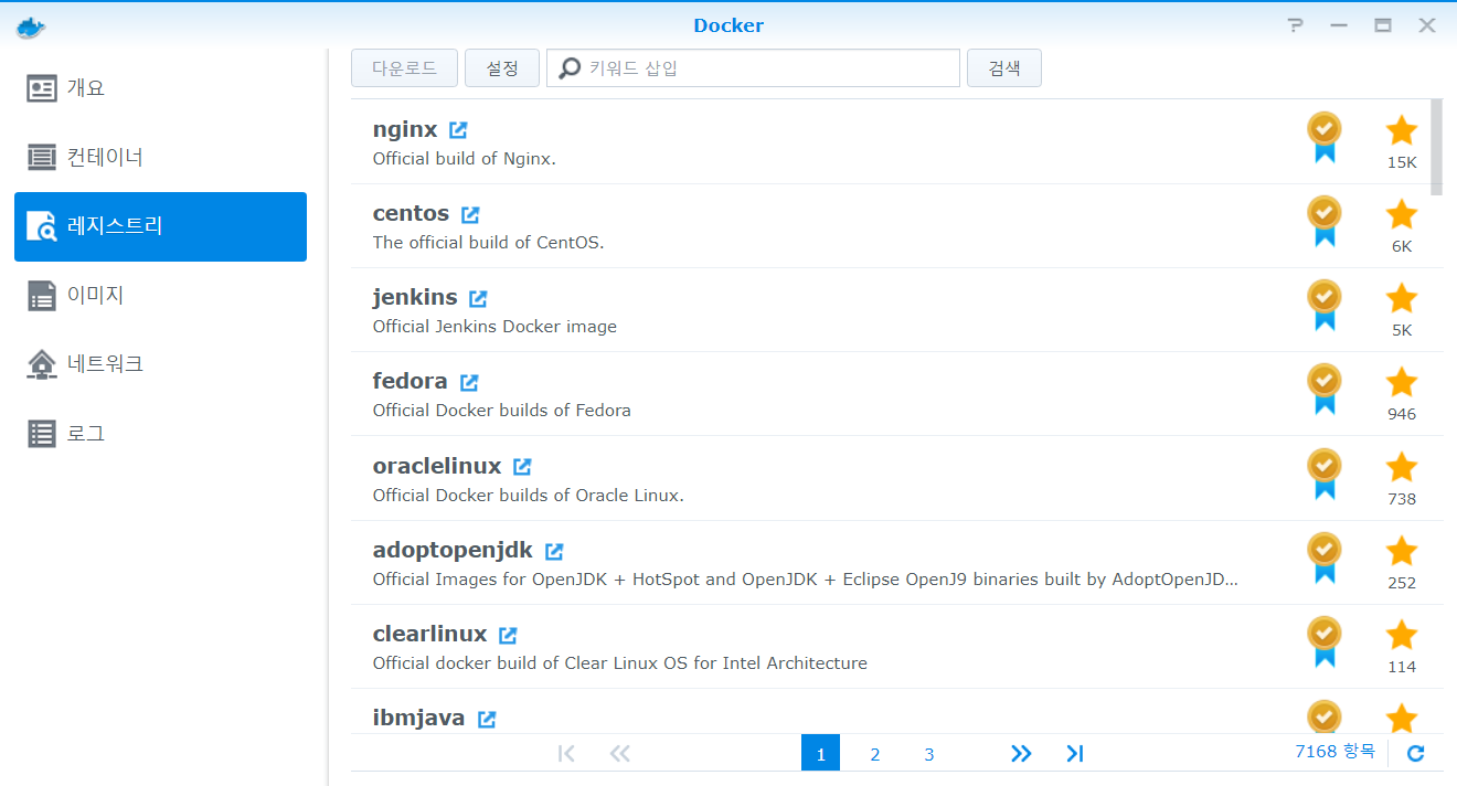 3. Docker 이미지를 모아둔 사이트인 'Docker Hub'의 역할을 대신 해주는 레지스트리 탭이 있습니다. (다운 받기 전에는 NAS 서버 외부에 존재합니다)